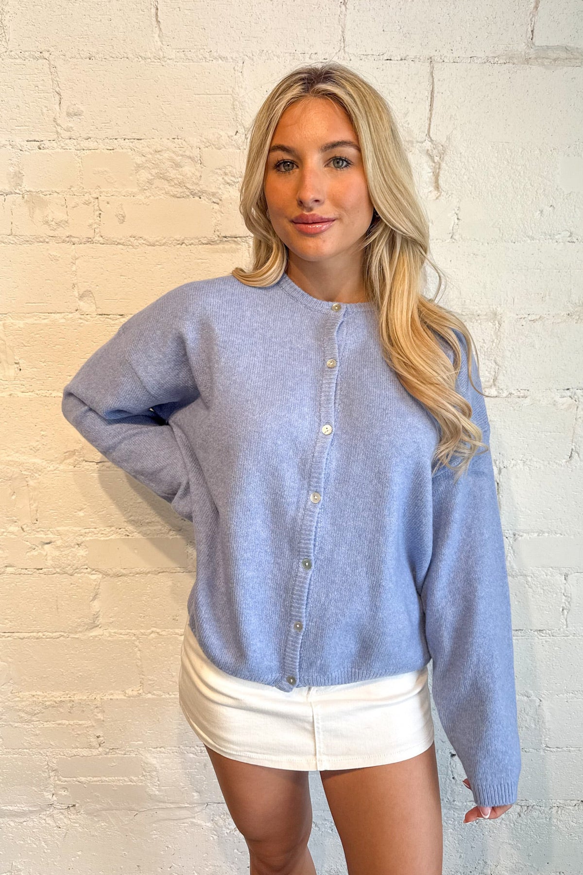 Cozy meets cute in the Cutesy Cardigan, the layering piece your wardrobe’s been waiting for. Available in two dreamy shades — soft ivory and playful purple — this cardigan adds just the right amount of sweetness to any outfit. Whether you're dressing up a simple tee or layering over a dress, the Cutesy Cardigan brings warmth and charm with zero effort. Designed with a slightly cropped fit and a flattering button-down front, it’s the perfect balance of relaxed and feminine. The knit is soft and breathable, making it ideal for transitional weather or cool indoor settings. Wear it buttoned up as a top or unbuttoned as a layer — either way, you’ll look effortlessly styled. From casual days out to cozy nights in, this cardigan is the kind of piece you’ll reach for again and again. Pair it with denim, maxi skirts, or over your favorite slip dress — it’s the ultimate cute-and-comfy essential.