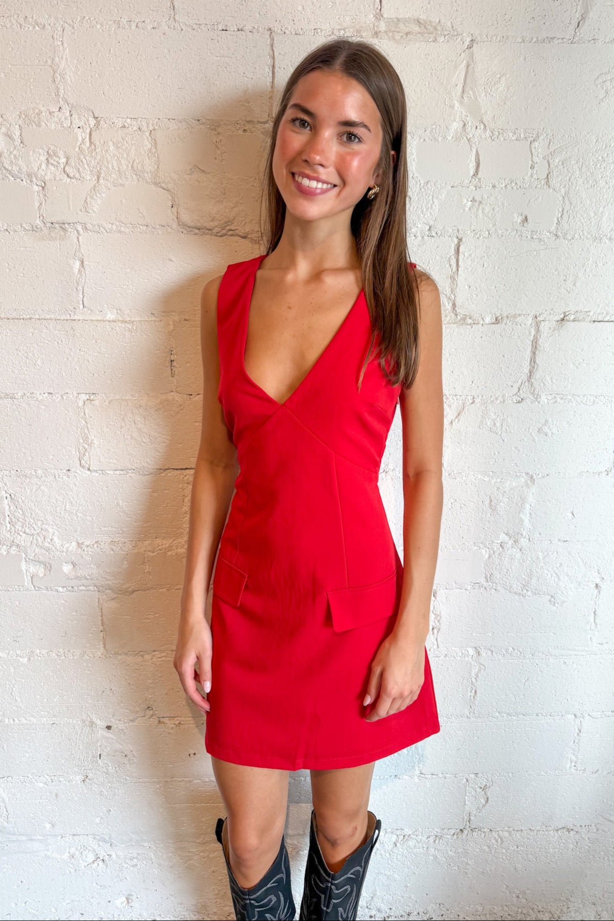 With its rich red hue, flattering V-neckline, and unexpected details (hello, pockets!), this dress is the definition of cute meets functional. It’s the piece you’ll throw on when you want to feel confident, comfortable, and totally put together — no overthinking required. Crafted from a soft, structured fabric that holds its shape, the Berry Spice Dress features a relaxed yet tailored fit that skims your figure just right. The deep V-neckline adds a touch of flirty sophistication, while the wide tank straps make it bra-friendly and perfect for layering. But the real star? The two front patch pockets — a cute, practical detail.