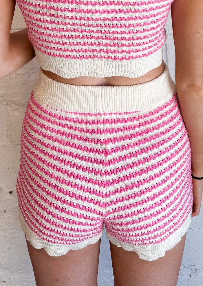 Embrace casual comfort with our pink and white striped knit shorts, a playful and stylish addition to your summer wardrobe that effortlessly combines laid-back charm with on-trend fashion.