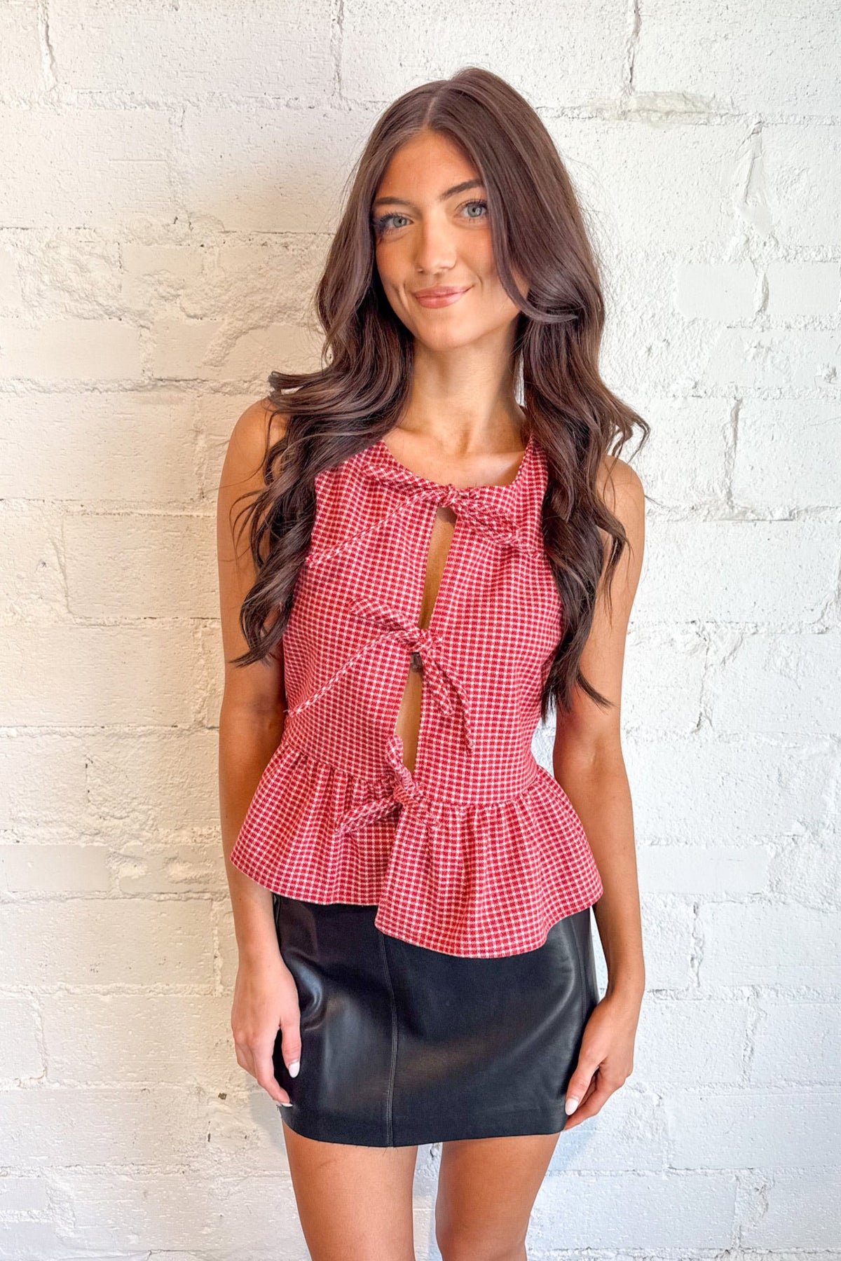 Featuring a classic red gingham print and a flattering tie-front design, this top brings vintage-inspired charm with a modern, flirty twist. Whether you're headed to a picnic, country concert, or casual brunch, this top is guaranteed to turn heads and keep things cute. Made from lightweight, breathable fabric, the Check Me Out Top is as comfortable as it is stylish. The cropped fit pairs perfectly with high-rise denim, skirts, or cutoffs, while the tie-front allows you to adjust the fit for your perfect silhouette.