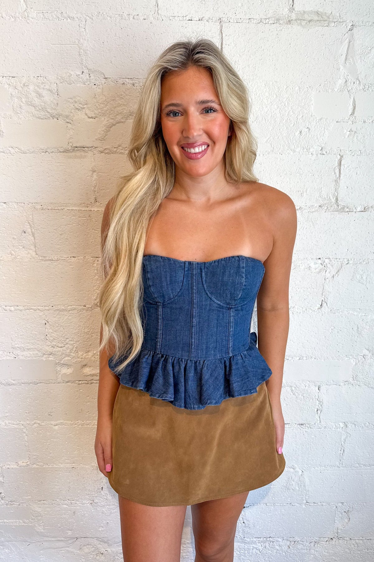 This top takes classic denim and gives it a flirty, fashion-forward twist with a sleek strapless silhouette and a flattering, fitted shape that hugs in all the right places. Crafted from medium-wash denim with just the right amount of stretch, the Denim Darling is designed to stay up and stay stylish. The structured bodice offers support and shape, while subtle seam detailing enhances your natural curves. Whether you're pairing it with matching denim for a chic double-denim moment or styling it with a mini skirt or leather pants, this top brings instant cool-girl energy.