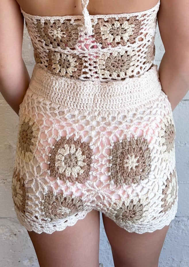 Elevate your summer style with these beige crochet shorts, featuring intricate detailing and a relaxed fit, perfect for adding a bohemian touch to your warm-weather wardrobe.