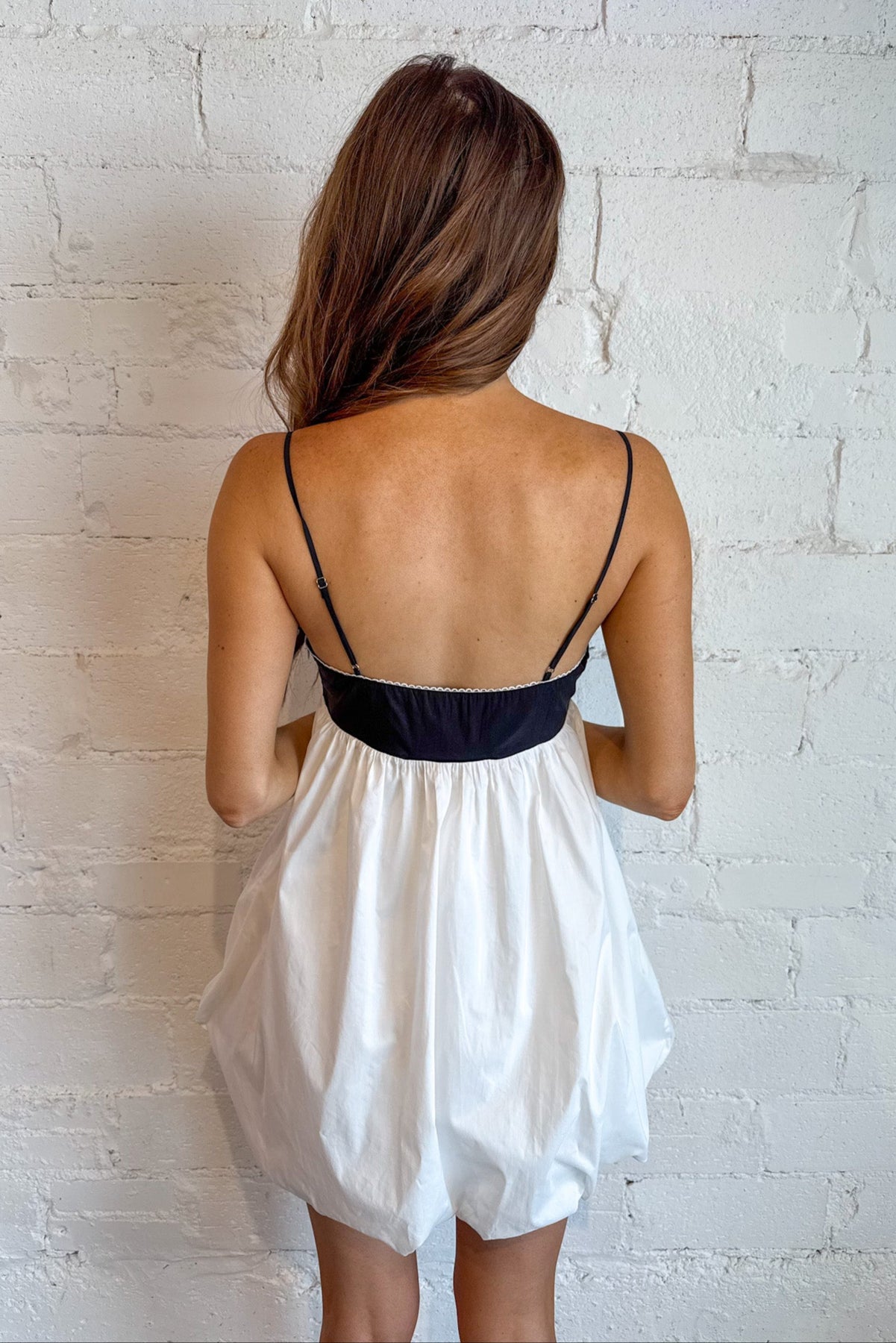 With its crisp bubble white body and striking black triangle cup detailing, this dress brings a fresh, fashion-forward take to a classic silhouette. Whether you're heading to a summer party, a rooftop dinner, or a vacation photoshoot, the Nicolette Dress offers the perfect combination of structure, softness, and standout style. This strap-style mini dress features a fitted bust with black triangle cupping that offers a sleek, flattering shape and just the right amount of edge. The contrast detail draws the eye and adds a modern, sculptural element to the otherwise romantic feel of the dress. The bubble white skirt flares out slightly, creating a playful yet polished silhouette that’s light, airy, and perfect for warmer days.