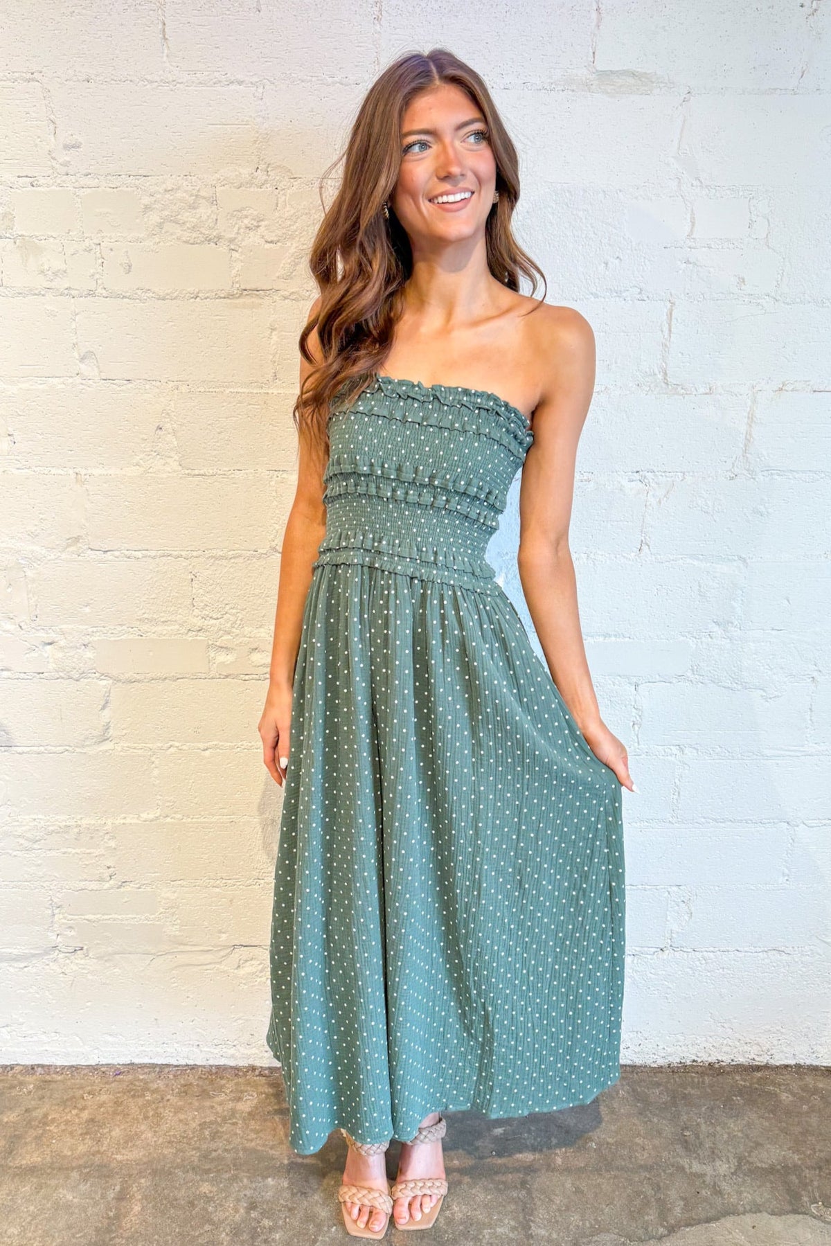 Olive Martini Maxi, Maxi Dress, Strapless Maxi Dress, Polka Dot Dress, Adeline Boutique, Dallas Boutique, Boutique Dresses