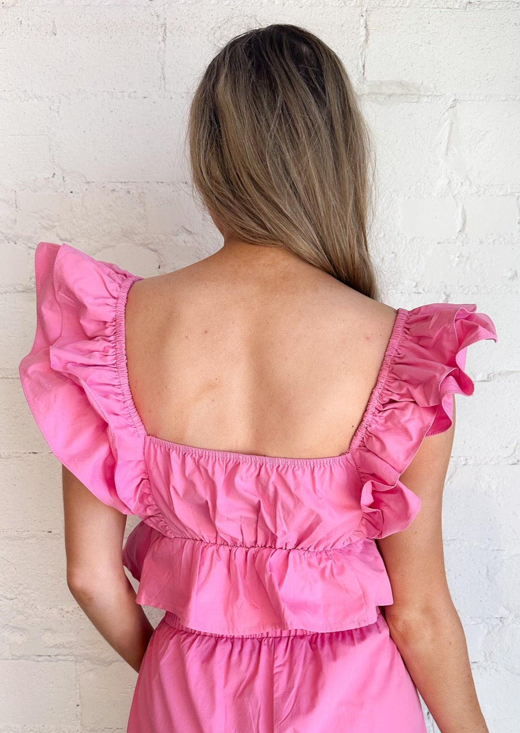 Step into playful sophistication with our pink ruffle top, a charming and stylish piece that seamlessly blends comfort and feminine flair for a delightful addition to your summer wardrobe.