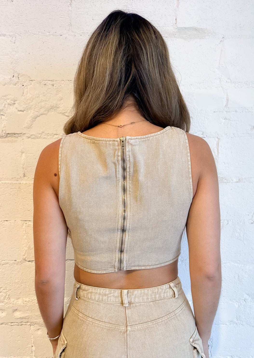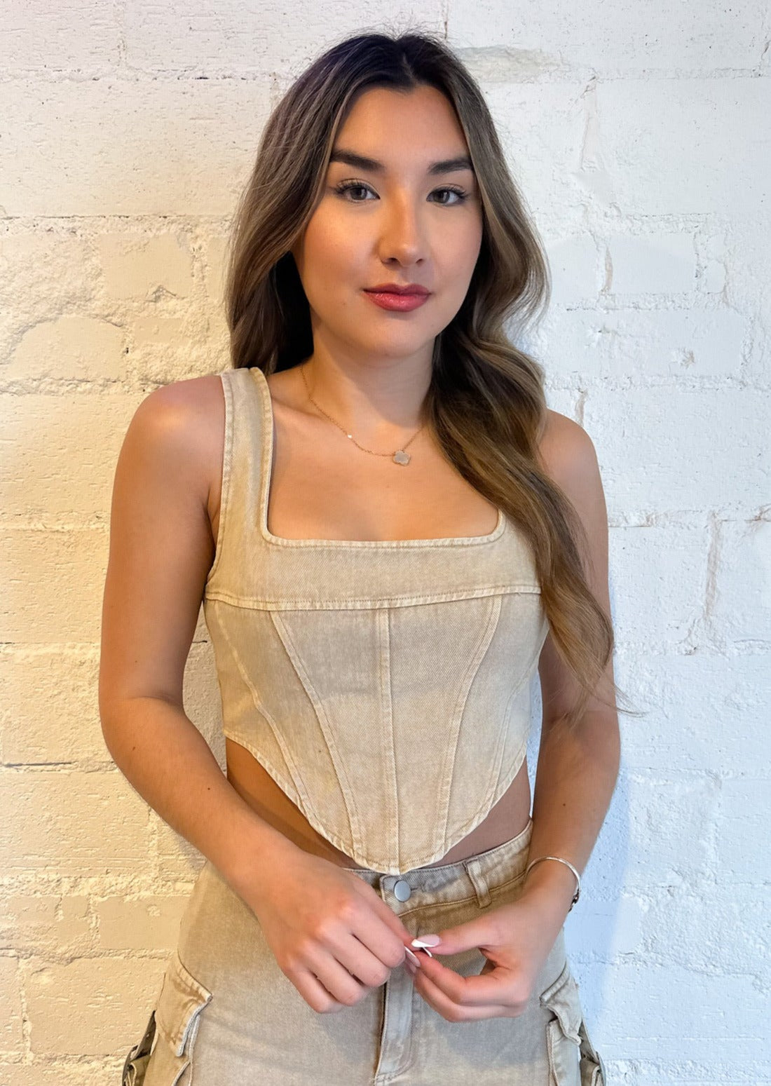 Revamp your wardrobe with this light brown corset top, a chic and versatile piece that adds a touch of modern sophistication to any ensemble with its structured silhouette and neutral hue.